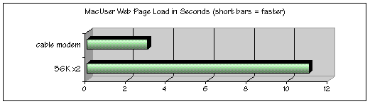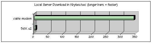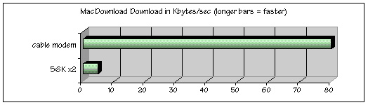 The Cable Modem outperformed the 56K modem in both web page loading (www.macuser.com) and shareware downloading (www.macdownload.com) from remote sites (I am located in Honolulu, thousands of miles away).