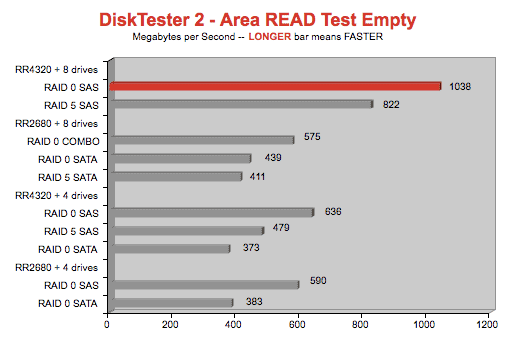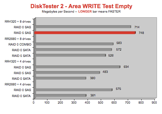 Note that the RR2680 hangs tough versus the R4320 as long as you only have four SATA drives. The RR2680 falls behind when you connect five or more drives. You'll will also need more than four drives to maintain 500MB/s+ when the RAID volume starts filling up.