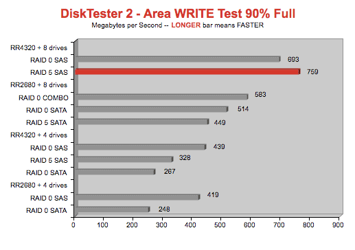 For this round, we used Disktester's Area Test defining a 4GB test file, 128MB chunk size, and 5 iterations. We sampled the RAID volume at 0% (empty) and at 90% (almost full). Though we have also tested with Kona System Test, we've learned from past experience that the results from DiskTester are essentially the same. In other words, DiskTester is very predictive of real world capture and playback of HD video, the most demanding streaming requirement.