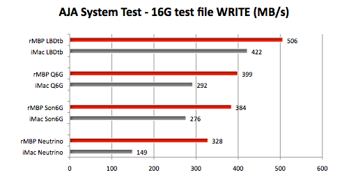 THOUGHTS The (Retina, 15-inch, Late 2013) MacBook Pro's Thunderbolt storage device WRITE speed was 20%, 37%, 39%, and 120% faster than the 'late 2013' iMac on the four respective Thunderbolt 1.0 storage devices we tested.