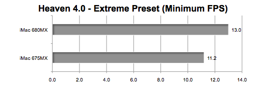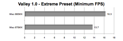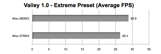 In the case of Heaven 4.0, the GeForce GTX 680MX GPU averaged 21.8% faster FPS than the 675MX. In the case of Valley, the 680MX averaged 10.6% faster. Considering the $150 for the 680MX only adds 5.7% to 7.5% to the price of the 27" iMac (depending on the configuration), I maintain it is a bargain upgrade.