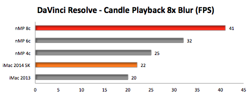 Using the popular Candle benchmark project (1920x1080), we measured playback frames per second with 8 blur nodes being rendered on-the-fly.