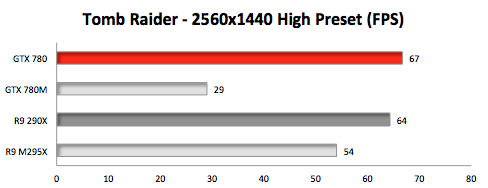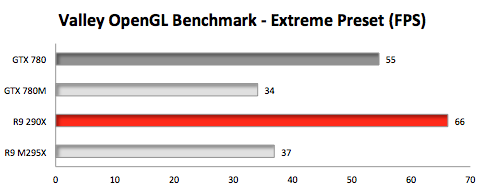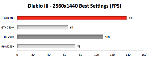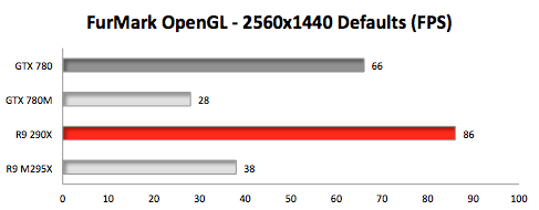 The iMac with Retina 5K Display features two mobile GPU choices: Radeon R9 M290X and R9 M295X. Are they comparable to the desktop version of the R9 290X? No. What about the GeForce GTX 780M in the 2013 non-Retina iMac? Is it comparable to a desktop version of the GTX 780? No. Allow us to illustrate how they compare in performance . . .