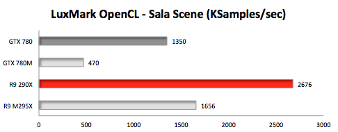 This is an OpenCL benchmark. We rendered the Sala scene using GPUs only. (RED graph bar means FASTEST in Thousands of Samples per Second.)