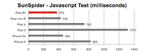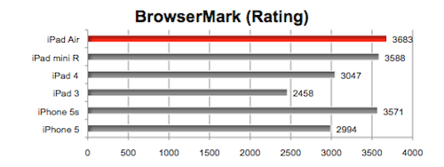 The iPad Air is truly twice as fast as the iPad 4 running the three CPU crunch tests and two GPU intensive tests above. BrowserMark was the only exception.