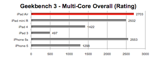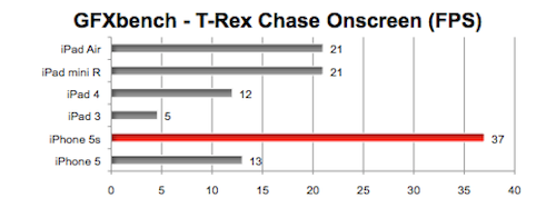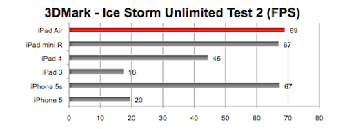 If you are wondering why the iPhone 5s beat the iPad Air, it's because it has fewer pixels to push. There is an "OffScreen" version of the benchmark but "OnScreen" better reflects "real world" experience.