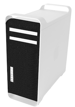 Trans International has a solution: a precisely cut foam dust filter that clings to the front panel of your Mac Pro. They call it 'iSchmutz." It has openings for the Mac Pro's optical bays, USB/FireWire ports, and power button.