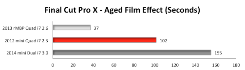 We imported a two minute 1440x1080 Apple ProRes 422 video clip. The first effect we rendered, Aged Film, is CPU intensive. (RED graph bar means FASTEST time in SECONDS.)