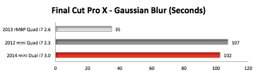 We imported a two minute 1440x1080 Apple ProRes 422 video clip. The Gaussian Blur effect is GPU intensive. (RED graph bar means FASTEST time in SECONDS.)
