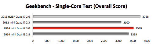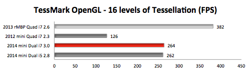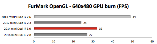 However, the tables are turned when it comes to single-core CPU intensive tasks or GPU intensive tasks. In those scenarios, the 2014 Dual-Core i7 with Intel Iris graphics wins. Before 2014 mini owners get too cocky, check out the included results for the 'late 2013' Retina MacBook Pro with a discrete NVIDIA GeForce GT 750M graphics processor.