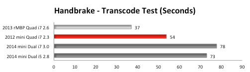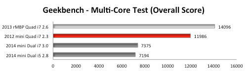 For multi-core CPU intensive tasks, the Quad-Core 2012 Mac mini excelled even with a lower core clock speed. The 'beating' would have been even worse if we had access to the CTO 2.6GHz Quad-Core i7 Mac mini from 2012. Notice we included the 'late 2013' Retina MacBook Pro's test results to demonstrate further the potential of a Quad-Core 2014 Mac mini.
