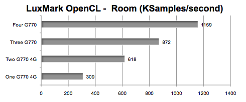 This is an OpenCL benchmark that renders with GPUs that support OpenCL. Furthermore, the latest version 2.1b2 supports multiple GPUs. We feature here the results from rendering the Room scene which is extremely complex (2,000,000+ triangles) and is available only on 64bit executables. (FASTEST = HIGHEST number in thousands of samples per second.)