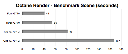 OctaneRender is a "GPU only" standalone renderer that can process scenes created in and exported from Maya, ArchiCAD, Cinema 4D, etc. -- and does so in a fraction of the time it takes with a CPU based renderer. However, currently it only works with CUDA capable NVIDIA graphics cards. The DEMO comes with a scene called octane_benchmark.ocs. For our test we selected RenderTarget PT (Path Tracing). The render time is tracked and displayed in total seconds.