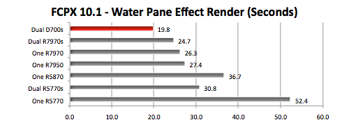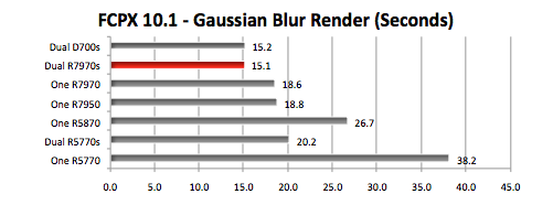 Both Final Cut Pro X 10.1 and Motion 5.1 are "optimized playback and rendering using dual GPUs in the new Mac Pro." For the Mac Pro tower, we included every AMD GPU from the basic factory Radeon HD 5770 to the flashed Radeon HD 7970. Notice how the pair of each of those extremes were helped by the new optimizations.