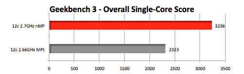 When it comes to CPU crunching, the 'late 2013' Mac Pro 12-core is faster than the 'mid 2010' Mac Pro 12-core in both single and multi-core tests.