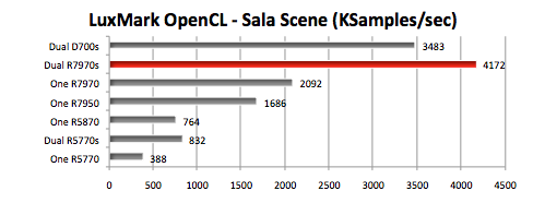 We featured LuxMark is an OpenCL benchmark since it not only renders the scenes with mutliple GPUs, but can render with ONLY GPUs. Surprisingly, the dual Radeon HD 7970s were able to generate more samples per second than the dual FirePro D700s. Of course, a single Radeon 5770, 5870, and 7950 are more typical of what most of you have in the 2010 and 2012 Mac Pro towers.