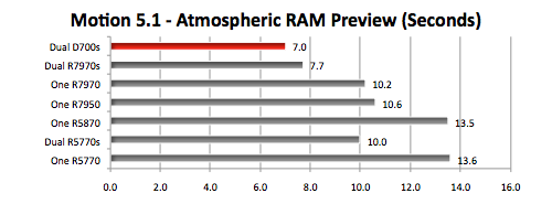 Motion 5.1 -- We rendered the RAM Preview of Atmospheric - Open sample project. (SMALLER number in Seconds is FASTER.)