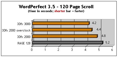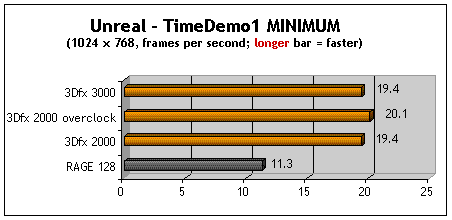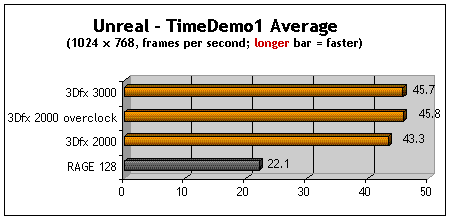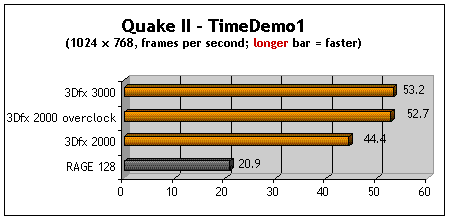 Conclusion: The 3Dfx Voodoo3 2000 (with the ROM tweak) is as fast as the model 3000. I guess if you can't afford a 3000 or already bought the 2000 during the recent rebate offer, you can take comfort in knowing that you can speed it up... if you want to.Even in the "un-tweaked" condition, the 2000 beats the RAGE 128.